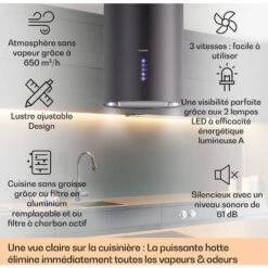 ÉLIMINER EFFICACEMENT LES ODEURS ET GRAISSES : Les graisses peuvent s’accumuler rapidement et présenter un risque d’incendie. La hotte a une capacité de dégraissage élevé et des filtres en carbone lavables en machine.