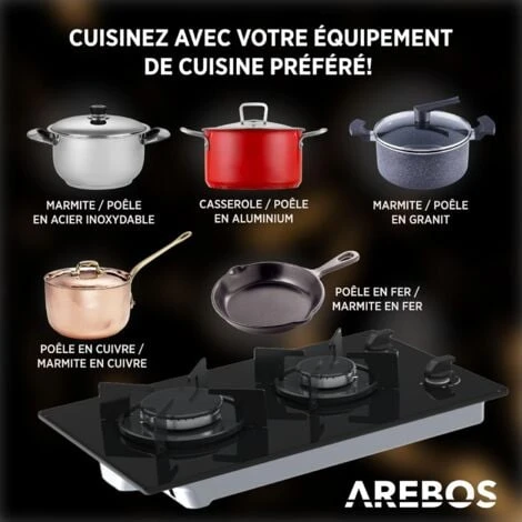 La cuisinière à gaz d’AREBOS permet une flexibilité maximale en ce qui concerne les ustensiles de cuisine. Qu’il s’agisse d’acier inoxydable, d’aluminium, de granit, de cuivre ou de fer, utilisez des casseroles et des poêles à votre guise.