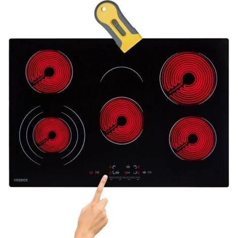 La surface des plaques à vitrocéramique d’AREBOS est en vitrocéramique, qui peut être facilement essuyée avec un chiffon humide. Les taches plus importantes peuvent être éliminées avec le grattoir inclus dans la livraison.