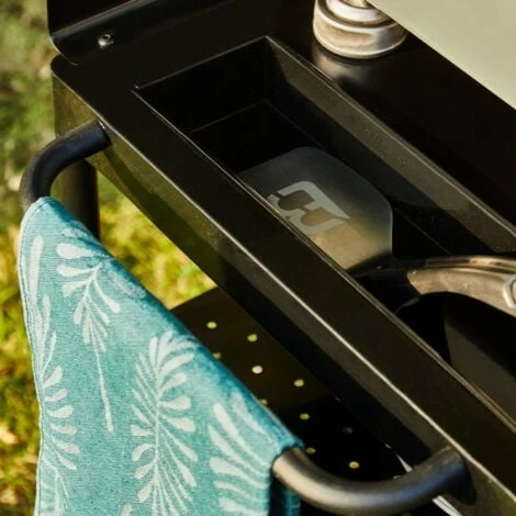 Espace de rangement fonctionnel : cette desserte à plancha dispose de 3 crochets pour pouvoir suspendre vos ustensiles ou encore accrocher vos torchons. Son réceptacle en acier est idéal pour y déposer vos ustensiles pendant vos cuissons, en plus d’être simple à nettoyer ! Sa tablette basse vous permettra d’accueillir quelques boissons ou votre huile méditerranéenne pour apporter du goût à vos plats. N’attendez plus pour équiper votre plancha et mieux organiser vos repas en extérieur !