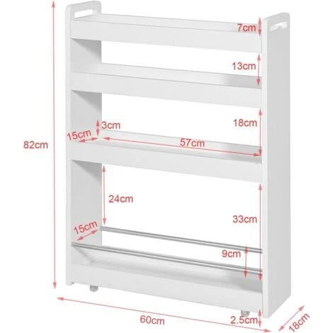 SoBuy® NSR01-W Étagère de Niche à Roulettes en Bois Tour de rangement Meuble de Rangement Cuisine Salle de Bain Chariot Placard Alcôve – 4 Étages Blanc Avec le chariot de niche que vous créez dans les lacunes ou les niches à 18 cm. un design élégant, super pratique meuble de rangement à roulettes en bois avec 4 étages de rangement solides pour ranger des choses à manger ou à boire, vaisselles ou ustensiles, etc. Gagner plus de l’espace de réserve pour la cuisine, chambre à manger ou salle de bains. Répondant à tous vos attentes : esthétique, belle qualité, belles dimensions et pratique, se range facilement dans un petit recoin, elle se fond dans le décor. Il trouvera sans problème sa place dans tous les étroits coins où vous avez besoin de rangement d’appoint ou de servir la table/le sofa. Les quatre étages spacieux peuvent être ideals pour quelques petites douceurs, les fournitures, l’équipement de nettoyage ou de rinçage. Les barres latérales peuvent empêcher efficacement la chute ou le renversement des objets. Pratique pour se déplacer à travers quatre roulettes en plastique solide. Montage facile et rapide. Instructions de montage à l’intérieur. Caractéristiques : – Matériau : bois MDF avec finition blanche, tube en acier inox. – Dimensions: L60xP18xH82cm. Poids maximum supporté : 20kg (5kg/étage). – Poids de l’envoi : 9,5kg.