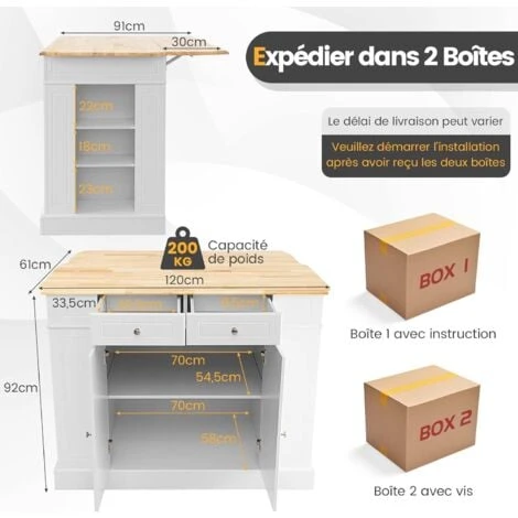 - 【Expédition en 2 cartons: 】Cet îlot de cuisine sera livré dans 2 cartons séparés, le délai de livraison peut donc varier. Les instructions détaillées seront dans premier carton et dans le second vous trouverez toutes les vis nécessaires, ce qui vous aidera à assembler. Remarque: veuillez commencer l’installation après avoir reçu les deux cartons.