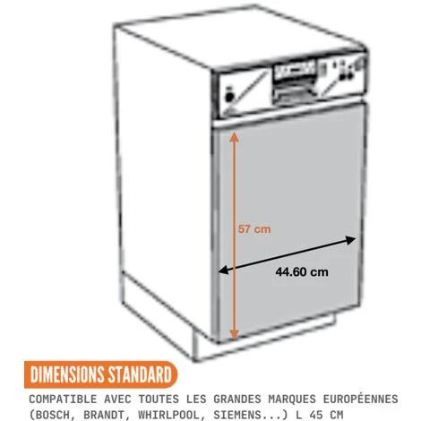 - Une dimension standard pour tous les lave-vaisselles 45 cm de marques européen avec bandeau de commande à l’extérieur