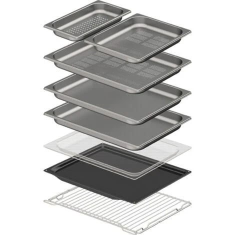 Accessoires fournis : 2 bacs Gastronorme (2/3 et 1/3) inox 18/10 perforés – 1 bac Gastronorme XL inox 18/10 perforé – 2 bacs Gastronorme XL inox 18/10 plein – 1 lèchefrite en verre – 1 plaque à pâtisserie – 1 grille avec taquet de sécurité..
