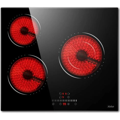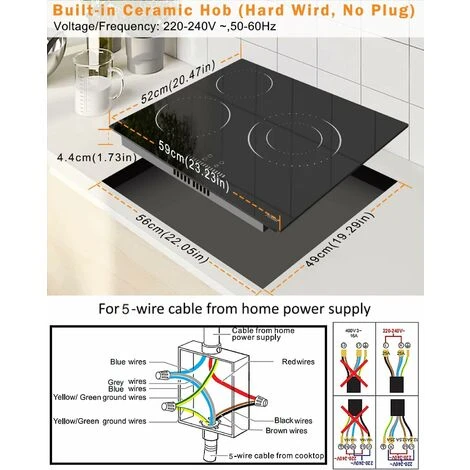 - 【Conception Encastrable】Plaque vitrocéramique 3 feux a un design encastrable, qui non seulement a l’air moderne et élégant, mais économise également beaucoup d’espace. La taille de plaque vitrocéramique est de 59 x 52 x 4,4 cm (23,23 x 20,47 x 1,73 in). La taille encastrable est de 56 x 49 cm (22,05 x 19,29 in). La plaque vitrocéramique n’a que des fil dur, pas de fiches, un câblage est nécessaire.