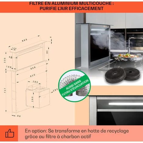 Comme un as dans votre manche : l’élégante hotte aspirante à courant descendant Klarstein Royal Flush Eco n’aspire pas par le haut, mais agit directement là où la vapeur est générée, tout près de votre surface de cuisson. Elle est donc particulièrement efficace et élimine de manière fiable la vapeur et les odeurs avec un débit d’air évacué de 576 m³/h maximum. Avec un design très élégant, elle s’intègre parfaitement et disparaît dans le plan de travail une fois le travail terminé. Et pour plus de durabilité, la Royal Flush Eco vous est livrée avec particulièrement peu de matériaux d’emballage en plastique.