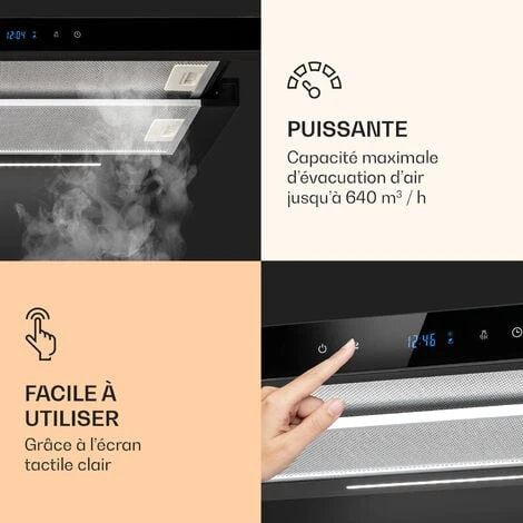 Puissance cachée : La hotte casquette extensible Klarstein Mariana Neo 60 impressionne par un puissant débit d’air extrait jusqu’à 640 m³ / h en 3 niveaux de puissance et une température de lumière librement réglable entre 3200 et 6500 Kelvin. Ainsi, vous réglez toujours le bon éclairage dans votre cuisine. L’utilisation se fait par écran tactile clair avec écran LCD. Par exemple, caché derrière votre étagère à épices, seule la façade vitrée ressort de sous l’armoire. Bien entendu, vous pouvez utiliser la Mariana Neo 60 comme hotte de recirculation ou d’évacuation d’air.