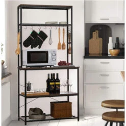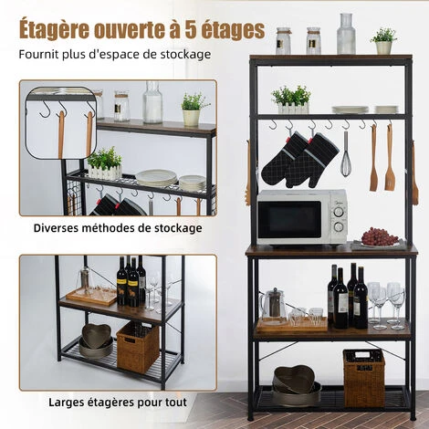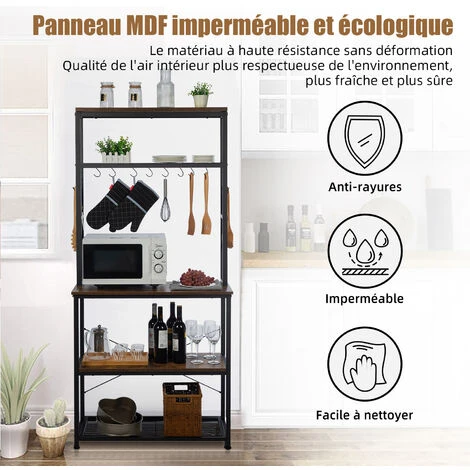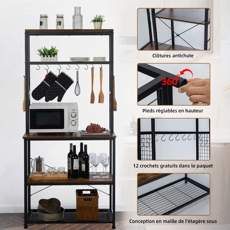 Notre meuble de cuisine à 5 niveaux avec 12 crochets vous offre une grande capacité de rangement et divers méthodes de stockage qui prend peu de place dans votre cuisine. Le meuble cuisine mélange le cadre en métal noir et les panneaux d’un grain de bois marron donnant à votre cuisine un style industriel unique. Notre étagère de cuisine est fabriquée en panneaux MDF à haute résistance sans déformation. Le matériau écologique rend l’air de votre intérieur plus fraîche et plus sûre. Le meuble est doté des clôtures antichute et des pieds réglables pour une utilisation plus sûre. Il peut être non seulement utilisé comme l’étagère de cuisine, mais aussi placé dans le salon, le bureau, etc. À vous décider !