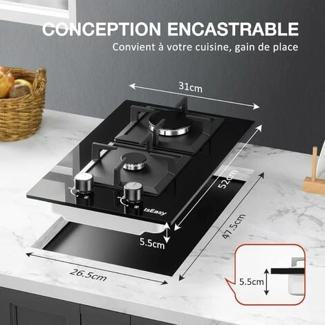 - Plaque à gaz 2 feux Encastrable -Panneau en verre trempé, épaisseur 8 mm.
