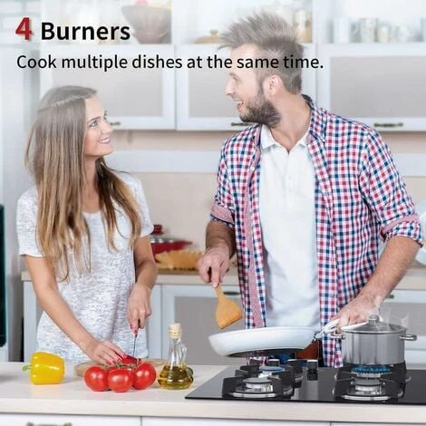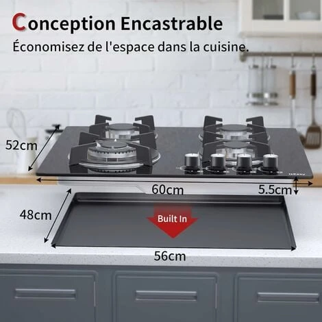 - 【4 feux Plaque gaz en verre】:Encastrable Conception – Panneau en verre trempé, épaisseur 8 mm – Facile à nettoyer.