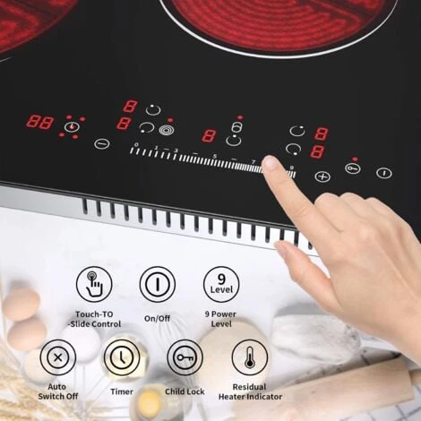 - 【5 zones Table de cuisson électrique】: 5 brûleurs haute puissance:1200W; 1200W; 1800W; 2000W; 2400W. Tension d’entrée AC: 220-240V. Il a une vitesse de chauffage plus rapide et une efficacité énergétique plus élevée.