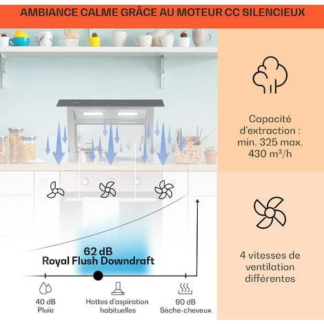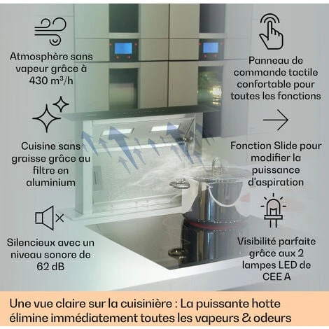 UNE ASPIRATION PUISSANTE ET SILENCIEUSE : Avec un débit d’air puissant de 430 m³/h et 4 vitesses de ventilation, notre hotte aspirante réduit les odeurs et filtre les fumées pour une meilleure qualité de l’air tout en restant siliencieuse.