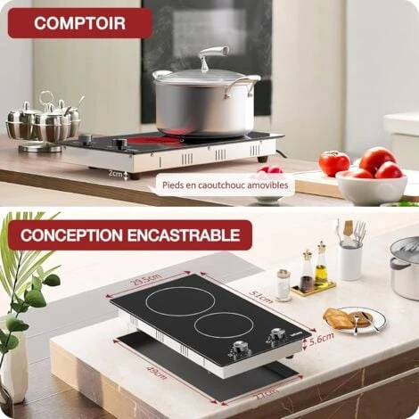 - Table de cuisson encastrable, Vitrocéramique 2 foyers, Plaque Vitrocéramique 2 zones