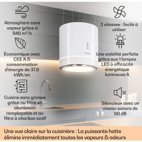 La perfection pour l’îlot de cuisson. Avec la hotte aspirante Klarstein Tron Ambience, les tables de cuisson autonomes reçoivent une touche finale de luxe, le nom de cette hotte en îlot annonce la couleur. La hotte s’accroche librement au plafond sur des câbles en acier de 140 cm résistants à la déchirure et offre une efficacité de la machine contre les fumées de cuisine. Avec ses trois niveaux de puissance, elle fait circuler la vapeur sans relâche avec un débit pouvant atteindre 540 m³ / h, libérant ainsi l’air de la cuisine de la graisse et des odeurs. Cela en fait un appareil idéal pour les grands espaces des cuisines américaines. L’éclairage LED intégré blanc et brillant de la surface de cuisson est disponible avec toutes les vitesses de fonctionnement, tandis que vous pouvez choisir l’un des trois niveaux de puissance facilement sur le panneau avant à affichage numérique.